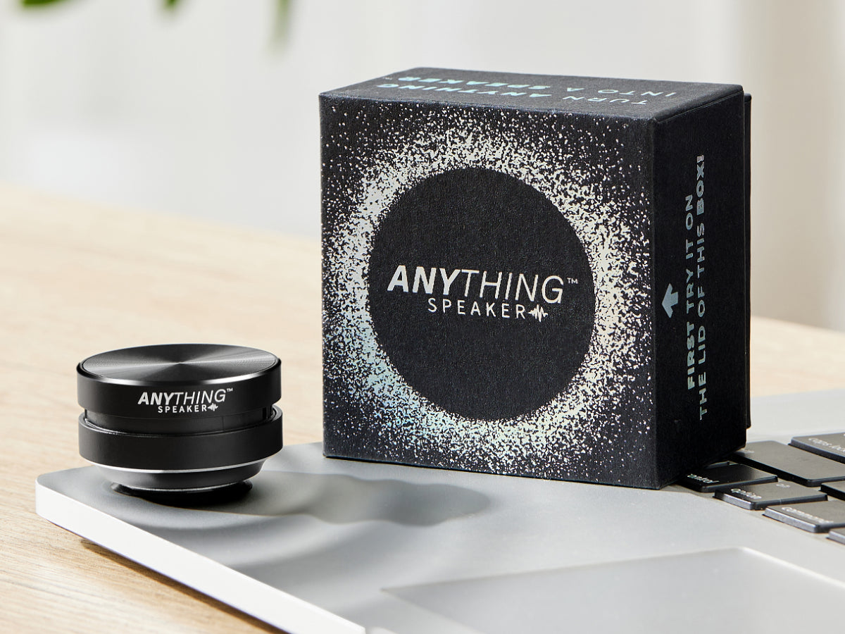 Anything Speaker™ uses bone conduction vibration technology to turn any surface into a soundboard. Simply attach it to a surface, and it amplifies sound through vibrations!